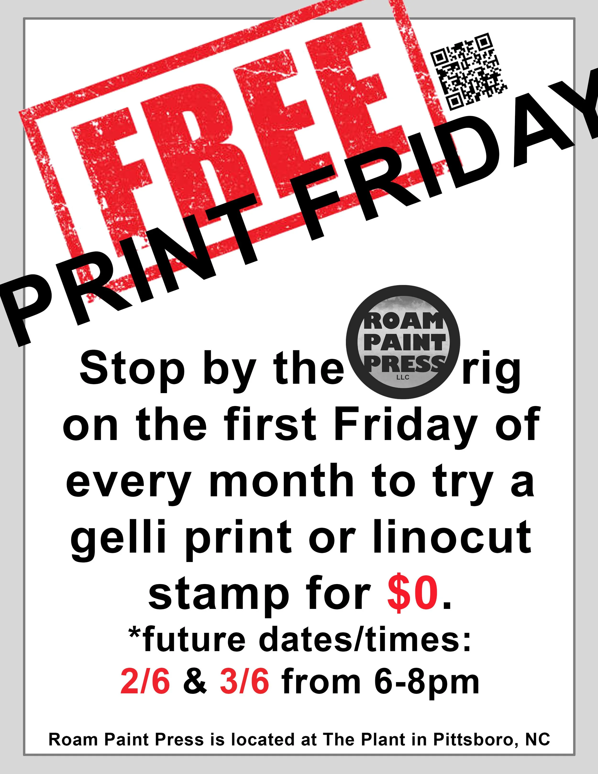 Friday 3/6 @ 6-8pm = Free Print Friday! & Open Studio. Stop by to try a print, check out the rig, the art and see what we have to offer.