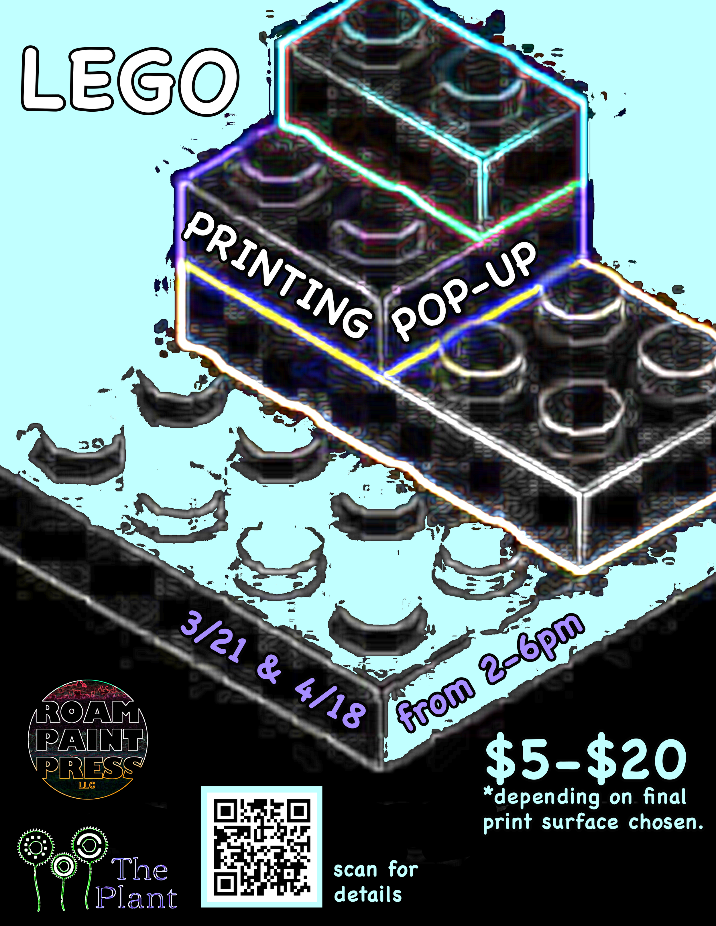 3/21, 4/5 & 4/18 @ 2-6pm = Lego Printing! Family Friendly class. Stop by anytime between 2 and 6pm to create a unique image with lego tiles, then print on paper or fabric. $5-$20 depending on final materials chosen for printing.