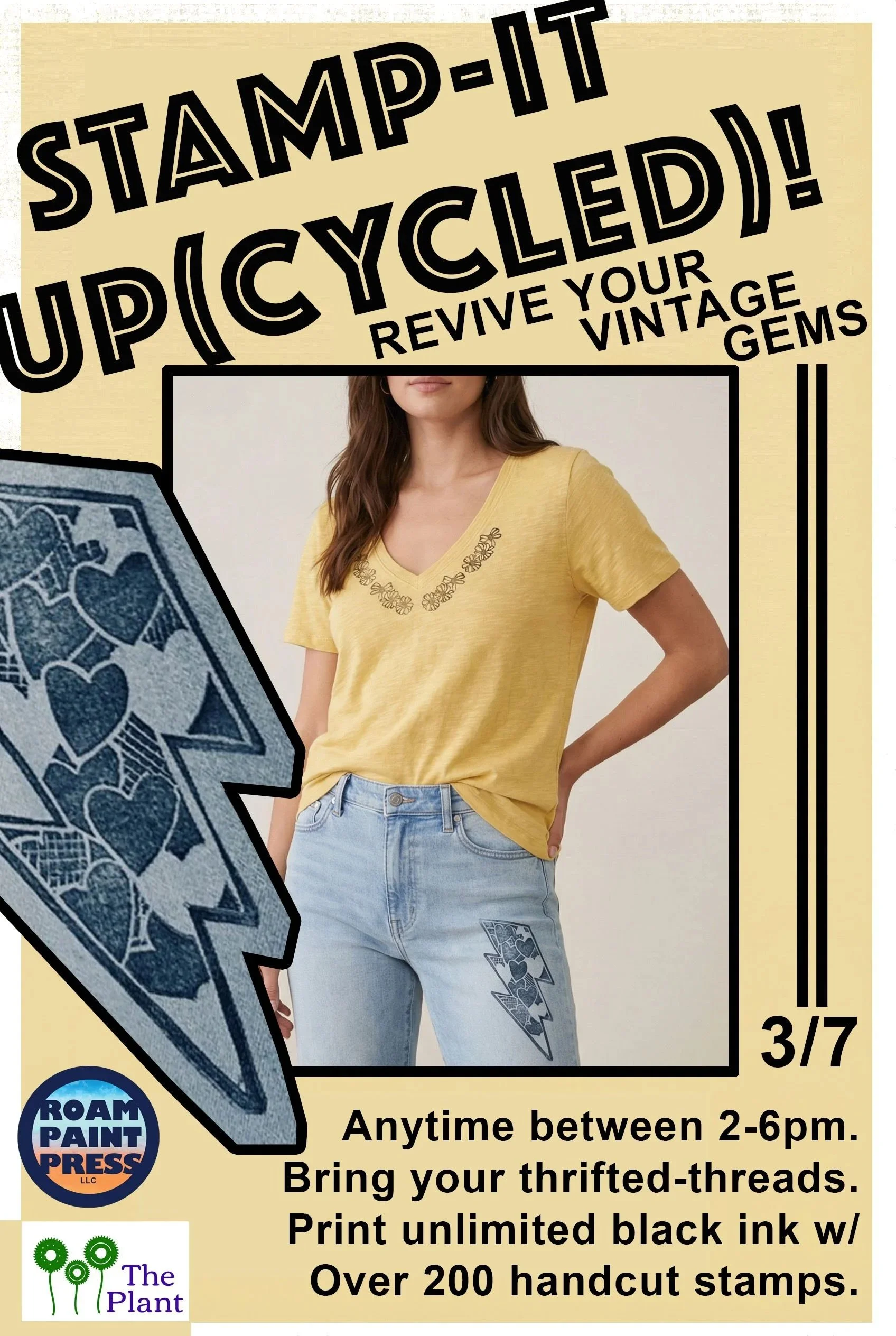 Saturday 3/7 @ 2-6pm = Upcycled Art POP-UP! Print from a large selection of handmade stamps on thrifted/old/vintage clothing. Bring in things you loved and make them feel new again. A selection of t’s, totes, kitchen towels and more will also be available for purchase. $10 for unlimited black ink.
