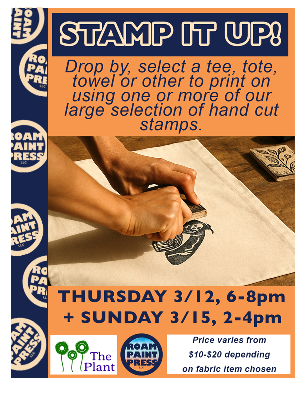 Thursday 3/12 @ 6-8pm = Stamp Pop-up! Stop by anytime between 6 and 8 to print on a t-shirt, tote, apron and more. $10-$20 depending on what fabric product is chosen to print on. This is a beginner friendly, all ages event.