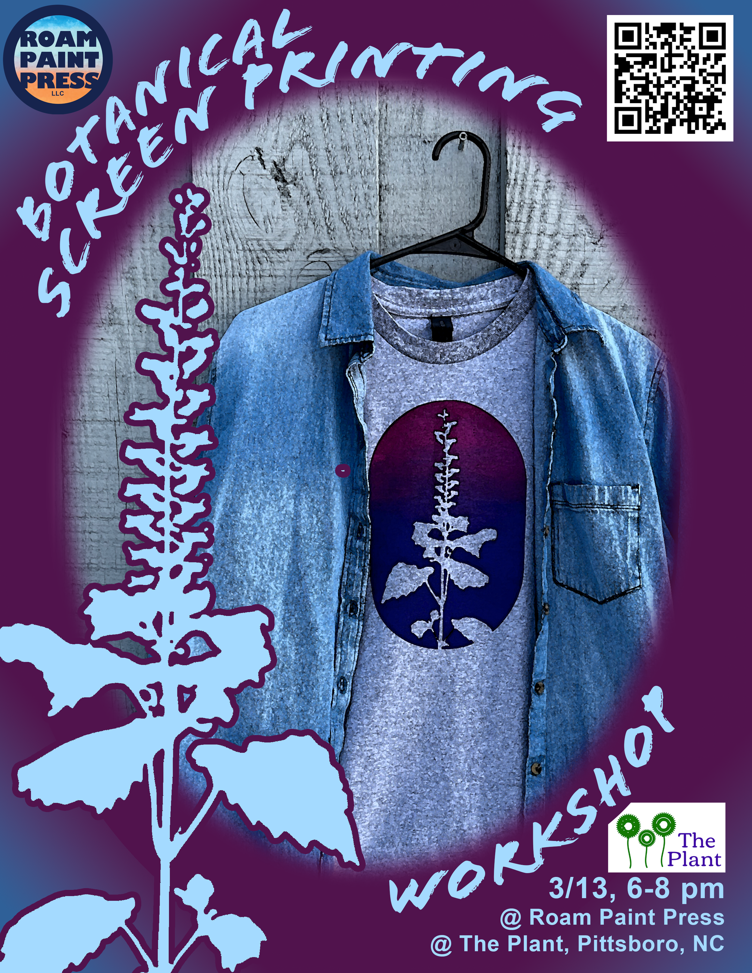 Friday 3/13 @ 6-8pm = Botanical Screen Printing Workshop. This is a 2-hour workshop in which you will learn the stencil technique of screen printing and get to print on paper and a t-shirt, tote, apron or other fabric option. This workshop costs $55 and has a 3 person minimum. Please RSVP via email or phone.