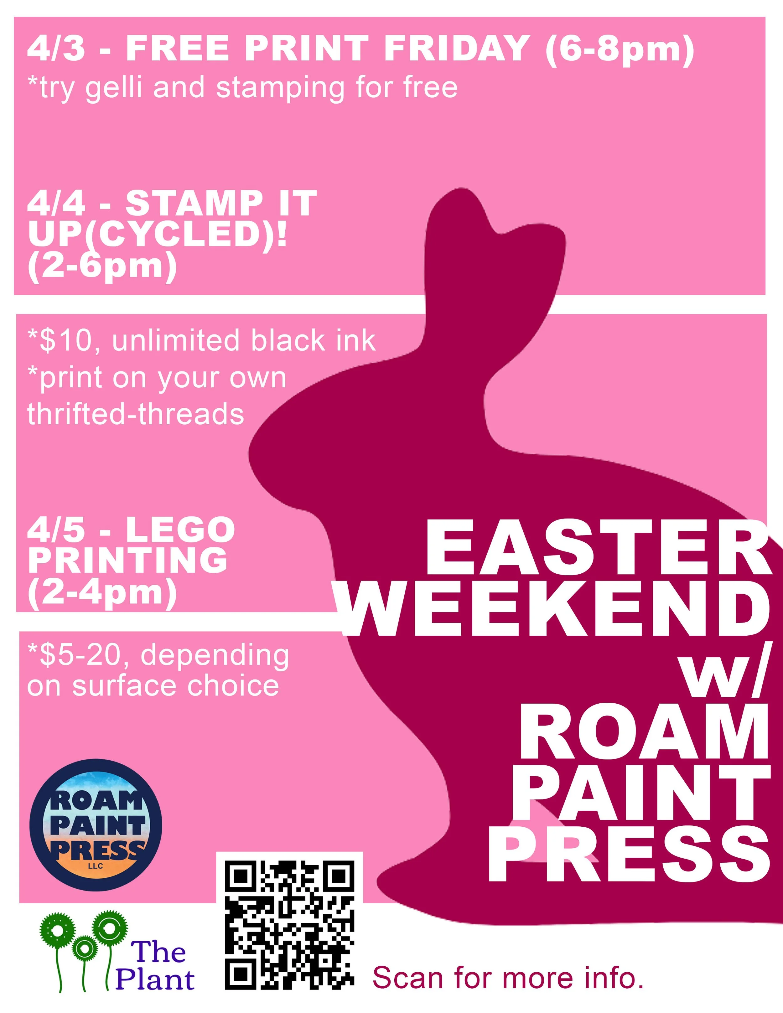 Friday 3/6 & 4/3 @ 6-8pm = Free Print Friday! & Open Studio. Stop by to try a print, check out the rig, the art and see what we have to offer. Try gelli, lego, lino and screen printing. This is a beginner friendly, all ages event.